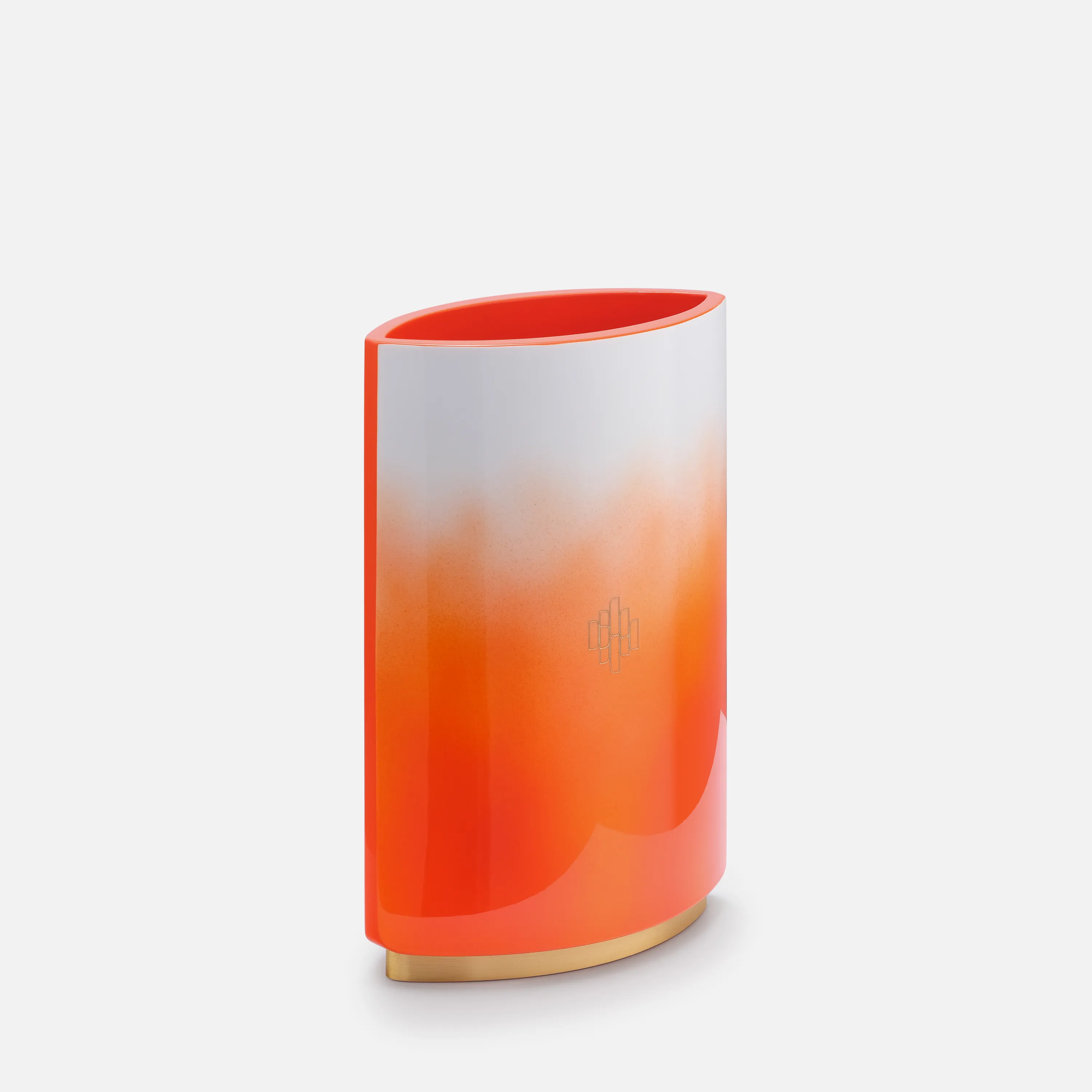 Bình hoa Flare nổi bật với hiệu ứng lan màu, tạo nên những mảng sắc đậm nhạt đầy ngẫu hứng. Đây là kỹ thuật mới của Hanoia khi trộn bột màu vào keo rồi tán đều trên bề mặt sản phẩm. Quá trình ấy đã tạo ra chi tiết thú vị - bột màu chưa tan hết vẫn đọng lại, tạo nên điểm nhấn khác biệt.