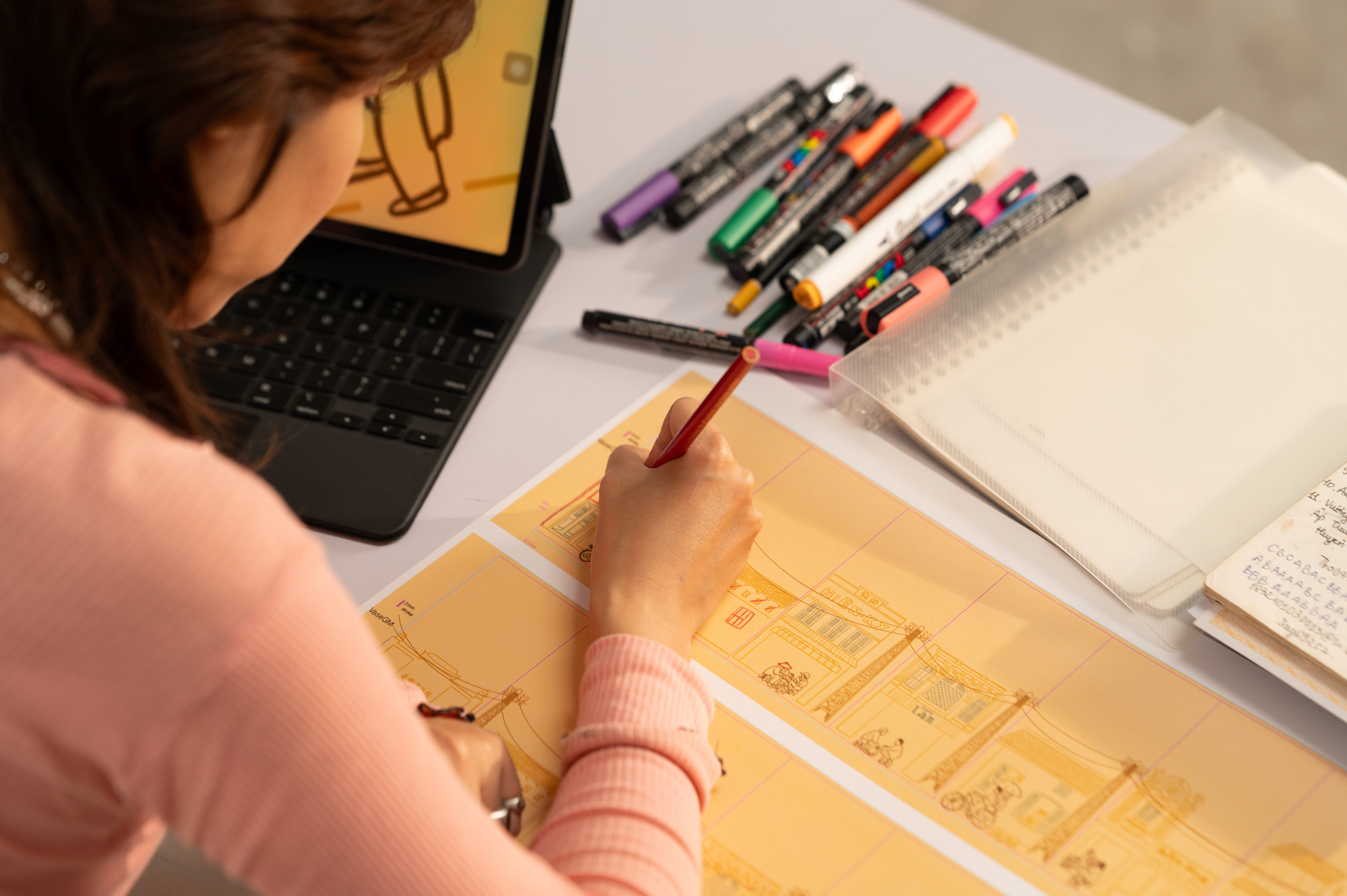 Với sự hỗ trợ nhiệt tình từ đội ngũ sản xuất, thiết kế của Hanoia, mình đã hiểu hơn rất nhiều về quy trình làm việc cũng như các chất liệu và kỹ thuật ứng dụng trên sản phẩm để chuyển thể bức tranh một cách tốt nhất. Ngồi nghiên cứu lại bản vẽ thiết kế, mình phải cân nhắc rằng liệu đó có còn là khung cửa sổ, ô mái ngói, con người của Hà Nội hay không trước khi thực hiện những thay đổi, tinh giản về mặt họa tiết và đường nét.