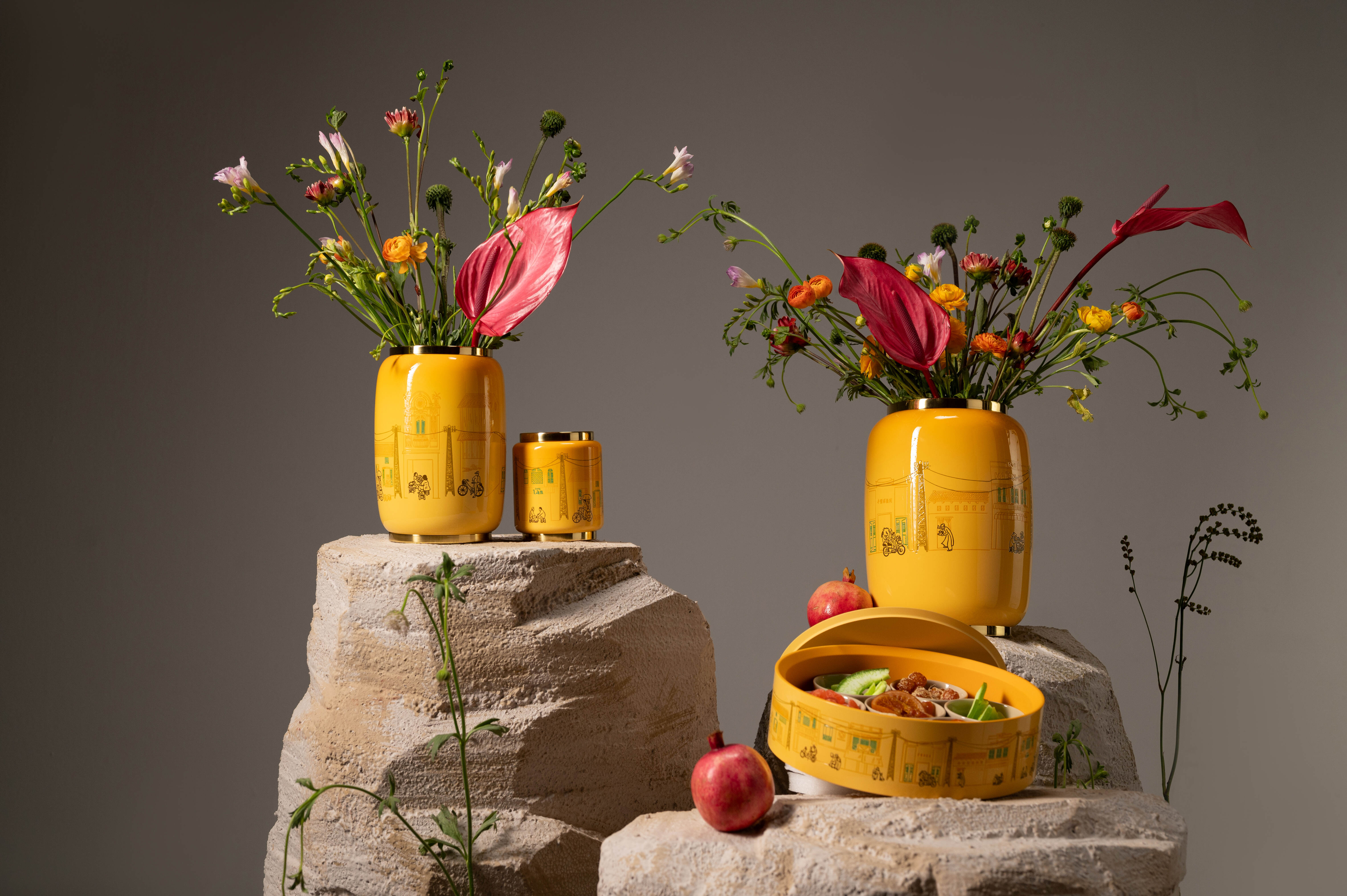 Ở một cách tiếp cận khác có phần thân thuộc hơn, trong khung cảnh phố phường với 2 phiên bản Hà Nội – Sài Gòn, Lys Bui cũng sáng tạo thêm một chi tiết mới dựa trên từng thiết kế bình hoa, hộp đựng của Hanoia. Len lỏi giữa những con hẻm nhỏ nhộn nhịp dòng người, họa tiết cột điện đặc trưng của thành phố chính là điểm kết nối đầy mới lạ giữa các khối hình, tạo sự dịch chuyển sống động quanh bức họa Thong Dong.