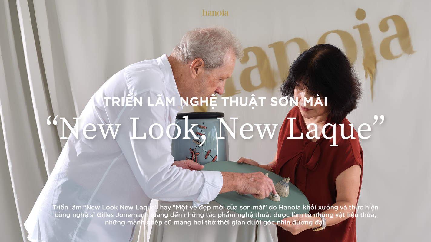 Triển lãm “New Look New Laque” đánh dấu lần đầu hợp tác của Hanoia với nghệ sĩ Gilles Jonemann - một trong những người đặt nền móng cho dự án Petit h của Hermès. Sự kiện trưng bày 24 tác phẩm độc đáo gồm bình hoa, khay, bát lớn đã qua sử dụng của Hanoia. Nghệ sĩ Gilles Jonemann kết hợp những đồ vật này cùng mảnh gốm, sành cũ; miếng sắt bỏ đi; mảnh vụn thổ cẩm; lưỡi liềm, dao cắt cỏ; những mô hình đơm đó bằng tre của thế kỷ trước… Đây là những mảnh ghép ông thu thập được từ chuyến thăm các ngôi làng cổ, tiệm đồ cũ, công trường xây dựng… ở Việt Nam, tuy nhỏ bé mà thấm đẫm yếu tố thời gian cũng như phản ánh tinh thần văn hóa Việt.