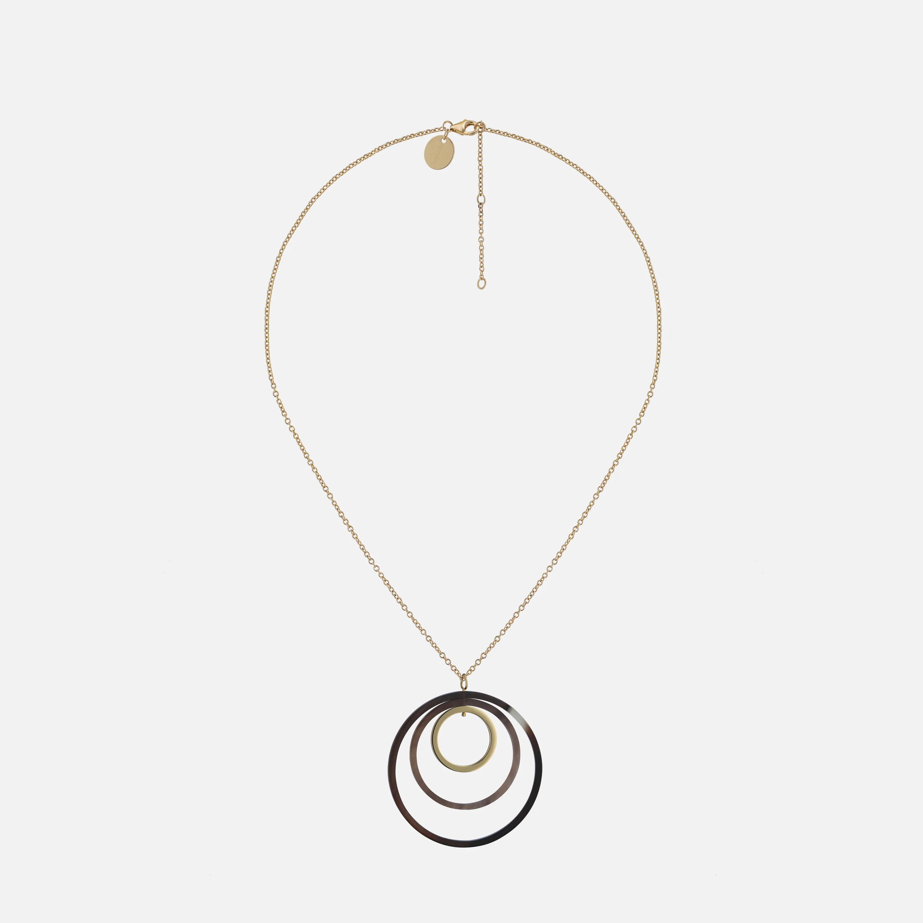 Mặt dây chuyền được tạo tác từ những vòng tròn đan xen, kết hợp đồng và sừng trâu sọc. Sự kết hợp của những chất liệu này mang đến sự tương phản thú vị giữa sắc màu và chất liệu.