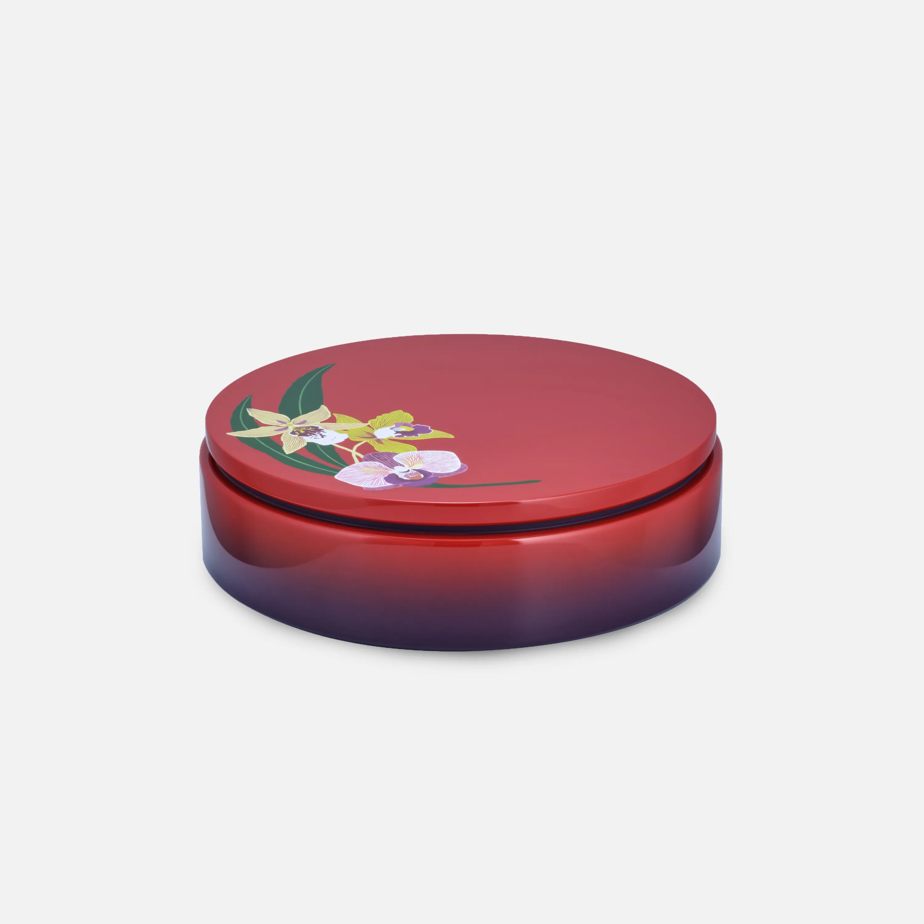 The lid of the lacquer box is adorned with a vibrant orchid garden, each blossom exuding unique beauty achieved through intricate techniques such as hand painting, coloring, and silk-lining. The body of the box employs a color gradient technique to create a striking focal point.