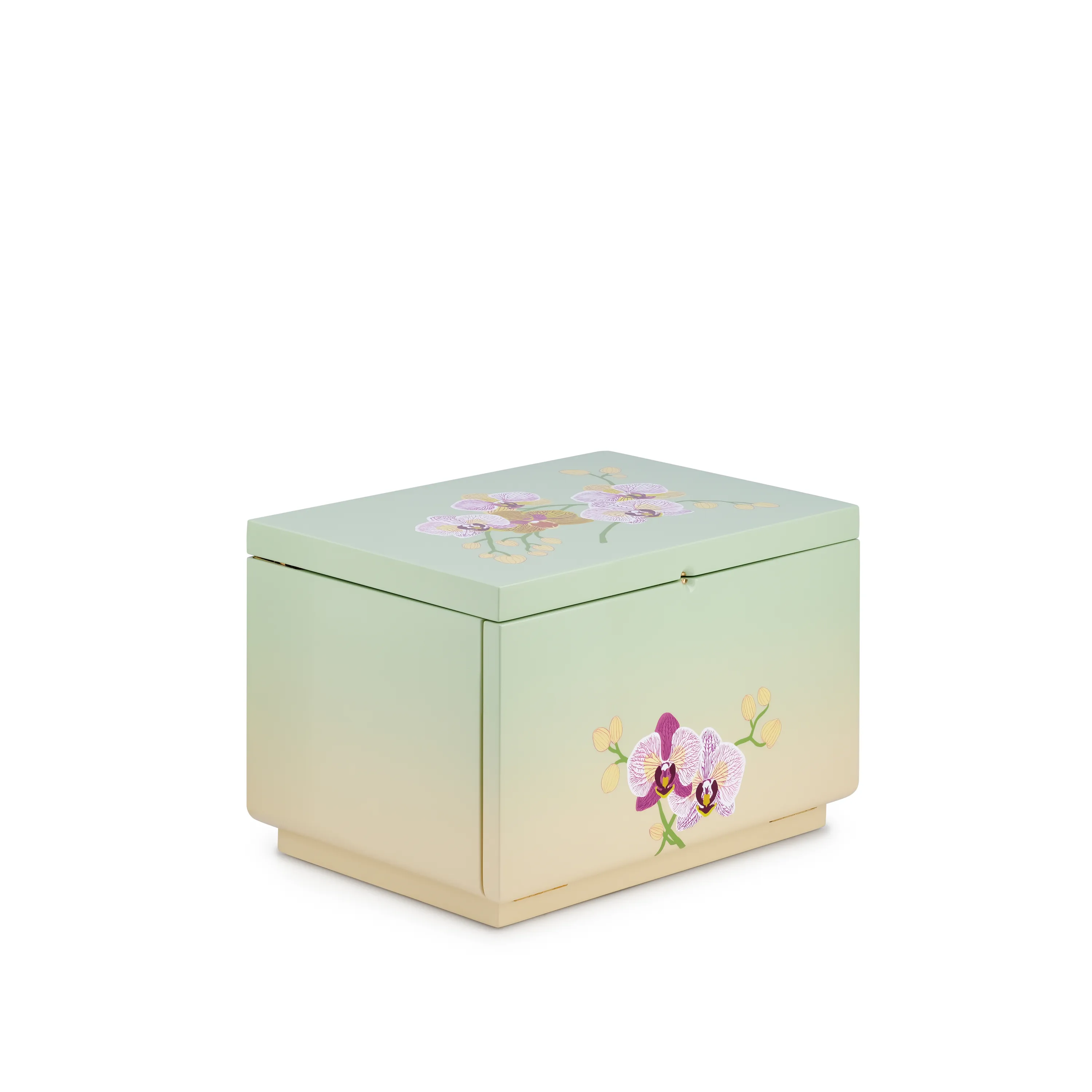 The jewelry box is adorned with a vibrant orchid garden, each blossom exuding unique beauty achieved through intricate techniques such as hand painting, coloring, and silk-lining. The body of the box employs a color gradient technique to create a striking focal point. Inside the box, there is a built-in mirror, two drawers, and small compartments for storing accessories.