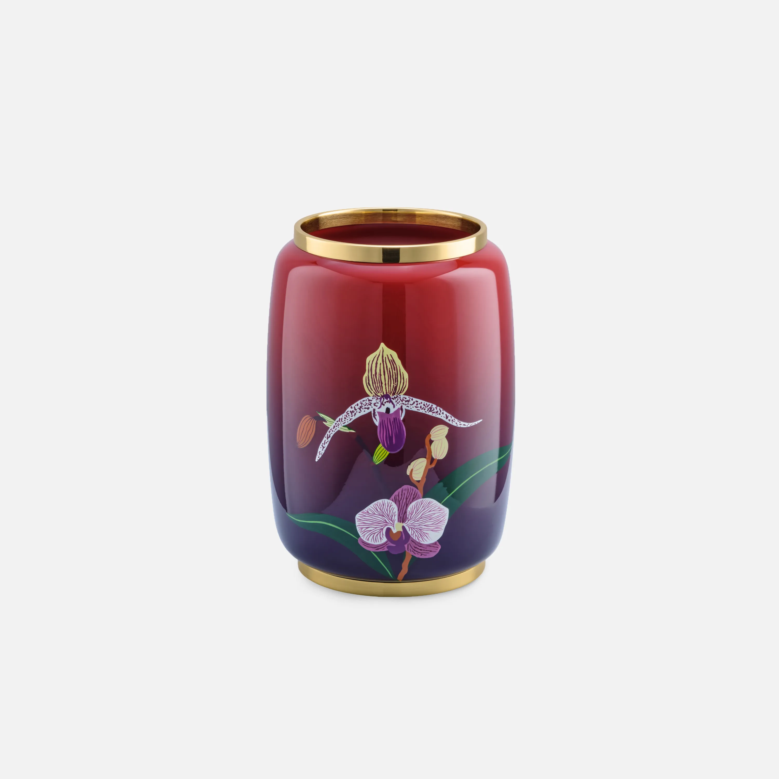 The lacquer vase is adorned with a vibrant orchid garden, each blossom exuding unique beauty achieved through intricate techniques such as hand painting, coloring, and silk-lining. The vase's body employs a color gradient technique to create a striking focal point.