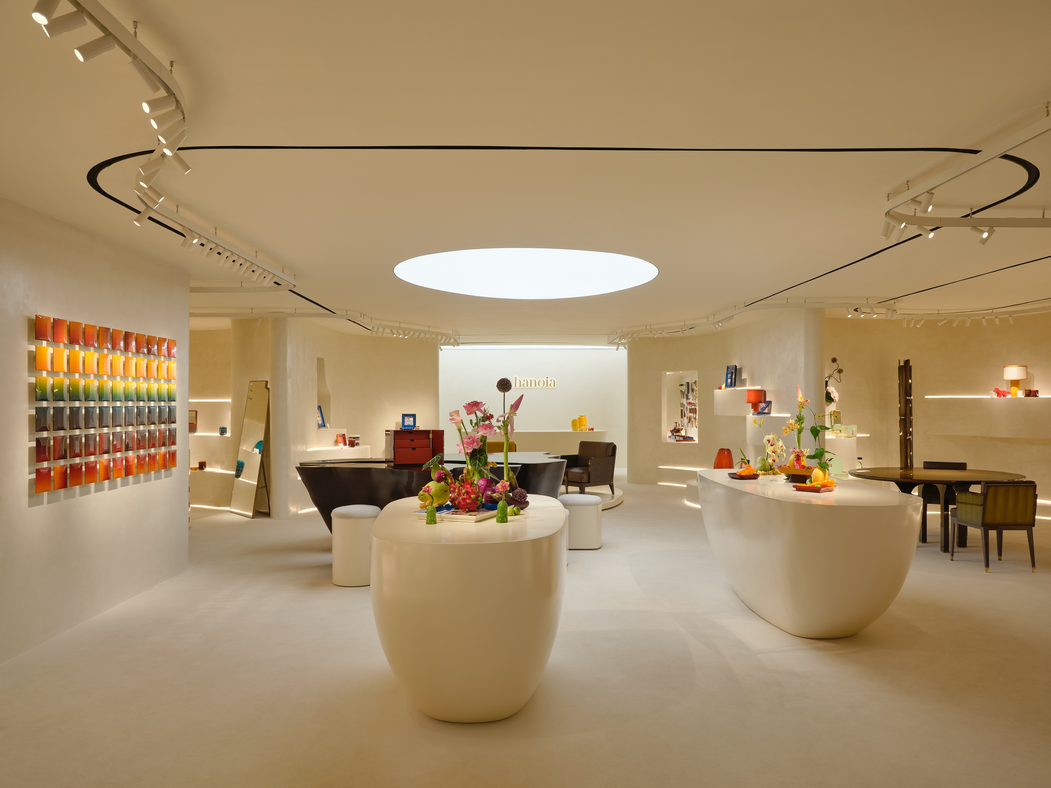 The symphony of light continues to perform through a space of perfect balance between stillness and movement, spacious yet concealing vivid layers of living concepts within Hanoia Press Club. Stepping through the doorframe with geometric structures reminiscent of Hanoia's familiar design motifs, one encounters a display system of pedestals, counters, and lacquered tables that blend organic forms, natural surface materials, and Hanoia's distinctive design language. The furniture subtly channels the space alongside gently curved walls that converge with display walls, featuring a unique highlight of tiered wall steps inspired by terraced rice fields—the beautiful "green architecture" amid silent mountains and ancient winds, carved into nature by human hands—and the layers of lacquer that also serve as the living essence upon Hanoia's creations. The binary color palette, dominated by white and beige paired with neutral color accents, is carefully chosen to honor the rich color spectrum across the collections: a distinctive code sequence unmistakable in the Artisan House's DNA.