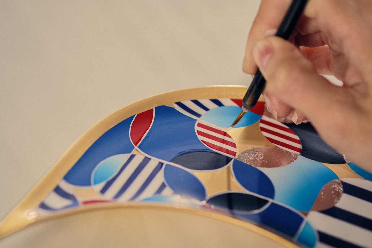 In the Deep Forest Edition, the surface was first roughened and then layered with silver leaf to create a metallic base. Decorating this base required extreme precision, as the tiny surface areas demanded a combination of multiple lacquer techniques. Even the smallest error could compromise the entire process. Finally, the fine white outlines around the spheres and striped motifs were painted entirely by hand — each brushstroke a test of patience, skill, and even breath control.