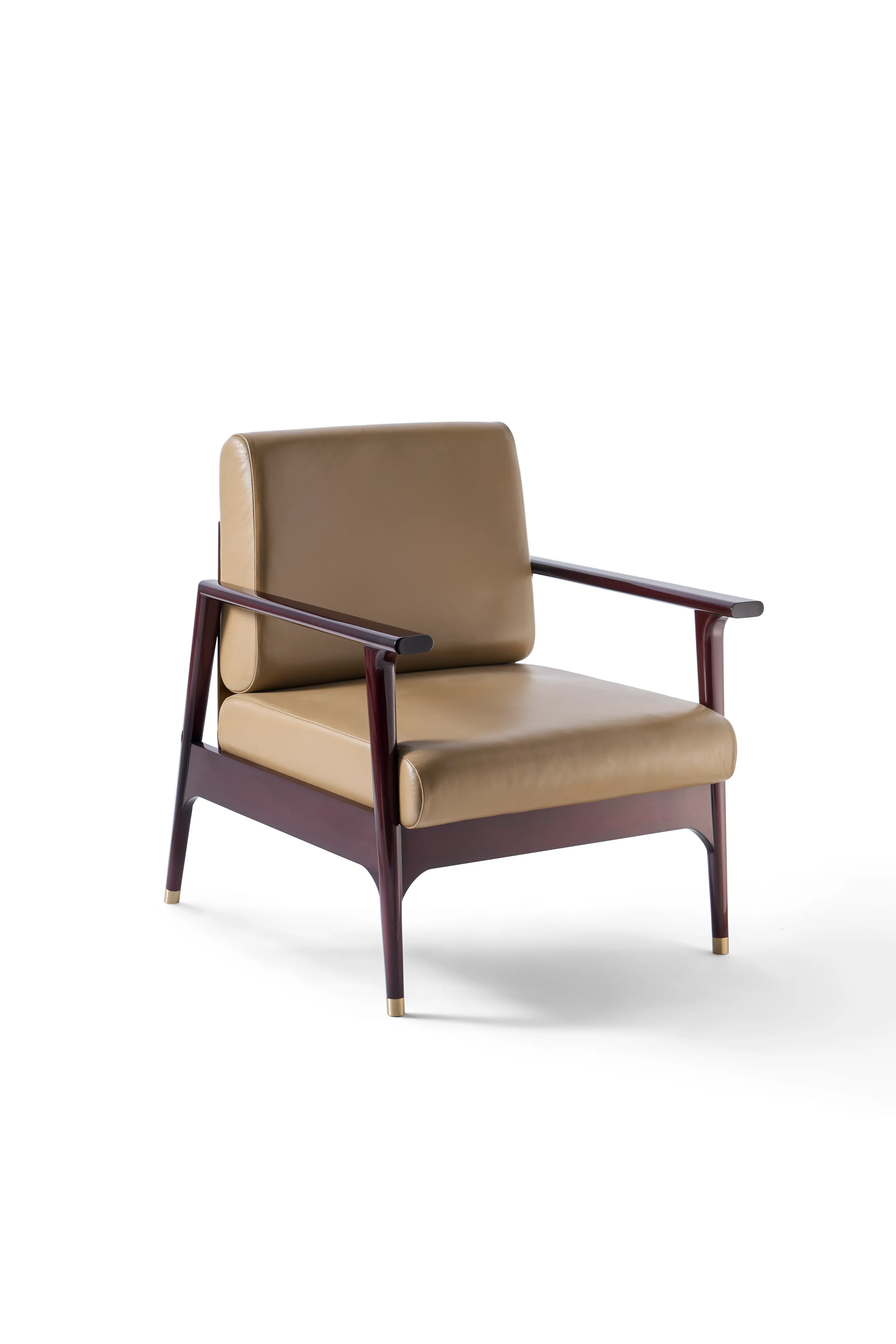 The elegant shape of the arms and legs of the chair was created by skillful craftsmanship, which made jags, hooks, and joins extremely delicate, contributing to the honor of the Oriental charm. The back is made of lacquered wood with a unique sanded colour texture. The frame and legs are made of painted wood, the cushion is upholstered in leather. This furniture can be made of oak wood or walnut wood according to customers' orders. The Courtly armchair is available in four colour options: gray, red, brown, and yellow.
