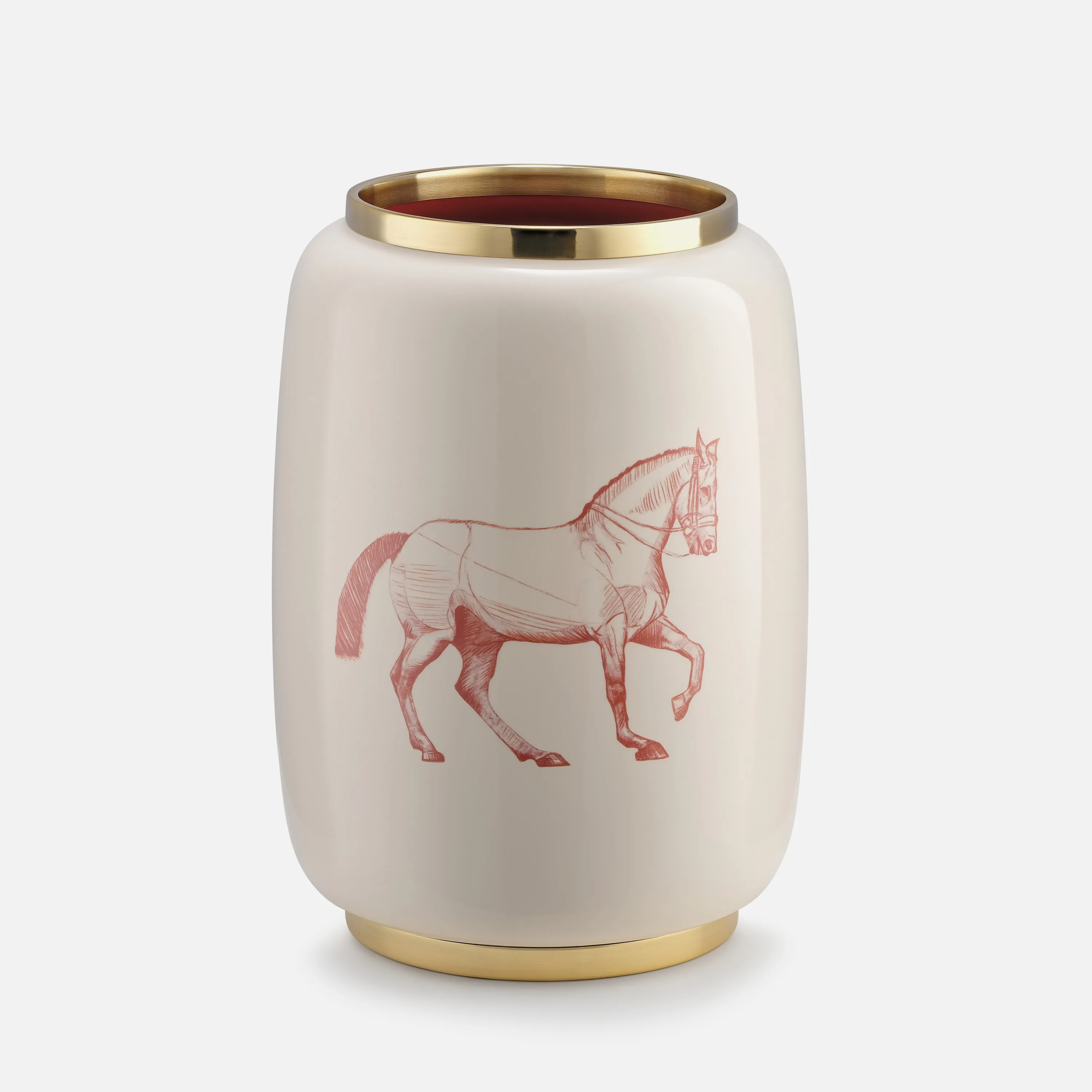 The lacquer vase features a horse leisurely striding, highlighted by red brushstrokes against an ivory-white background. Every detail is carefully depicted, from the softness of the fur to the strong muscles and graceful movement of the animal.