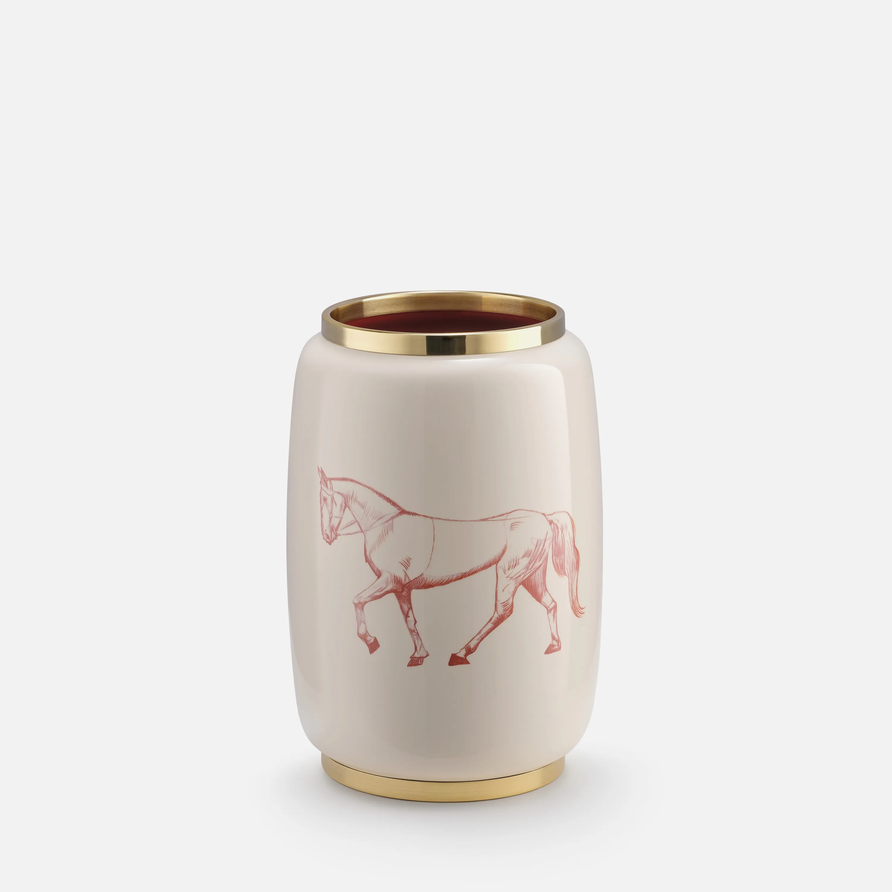 The lacquer vase features a horse leisurely striding, highlighted by red brushstrokes against an ivory-white background. Every detail is carefully depicted, from the softness of the fur to the strong muscles and graceful movement of the animal.