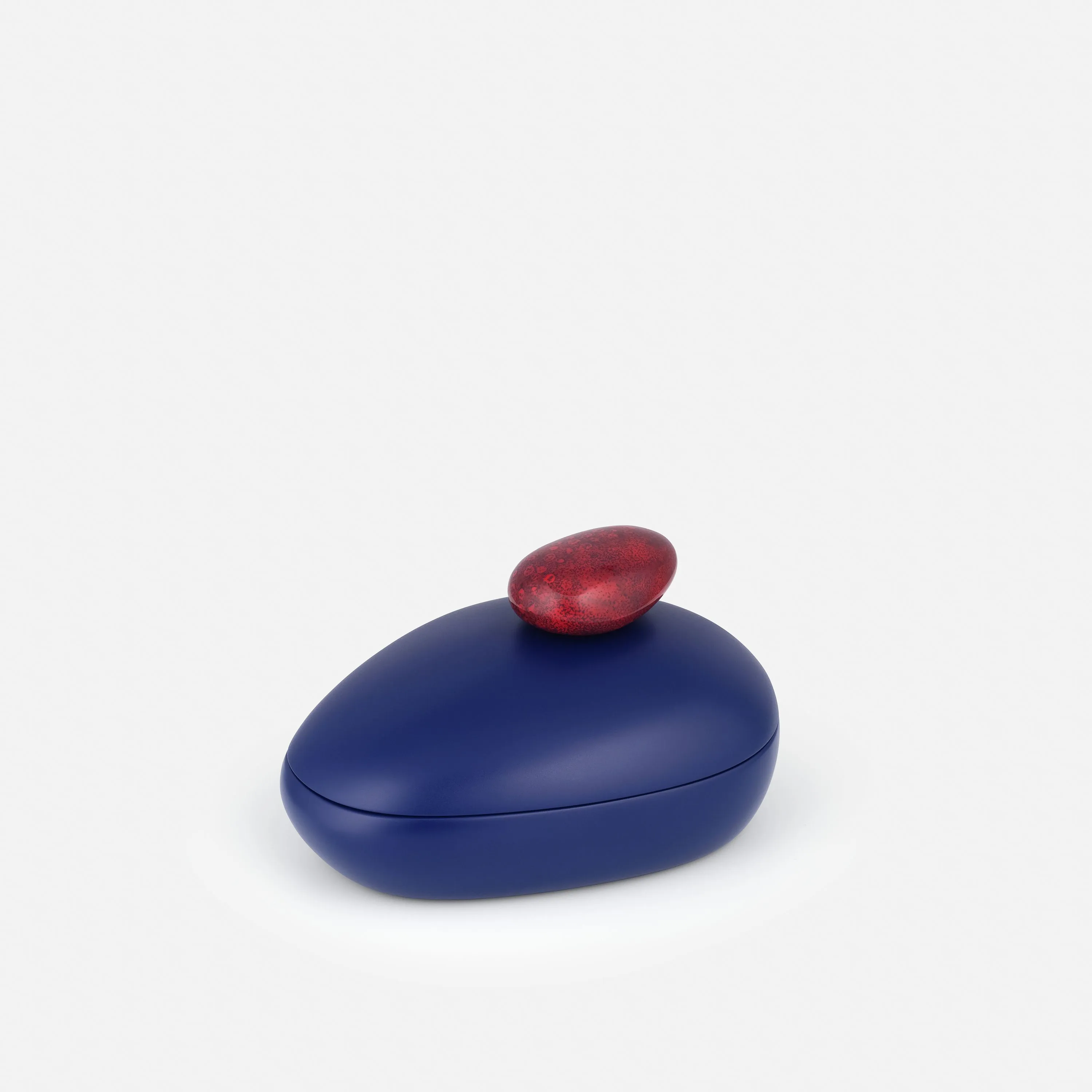 The oval lacquer box showcases a distinctive lacquer effect in an elegant deep blue hue. Its lid is adorned with a meticulously crafted pebble design, achieved through hand-applied color dotting and sanding techniques. This exquisite detail adds a prominent artistic touch to the product.