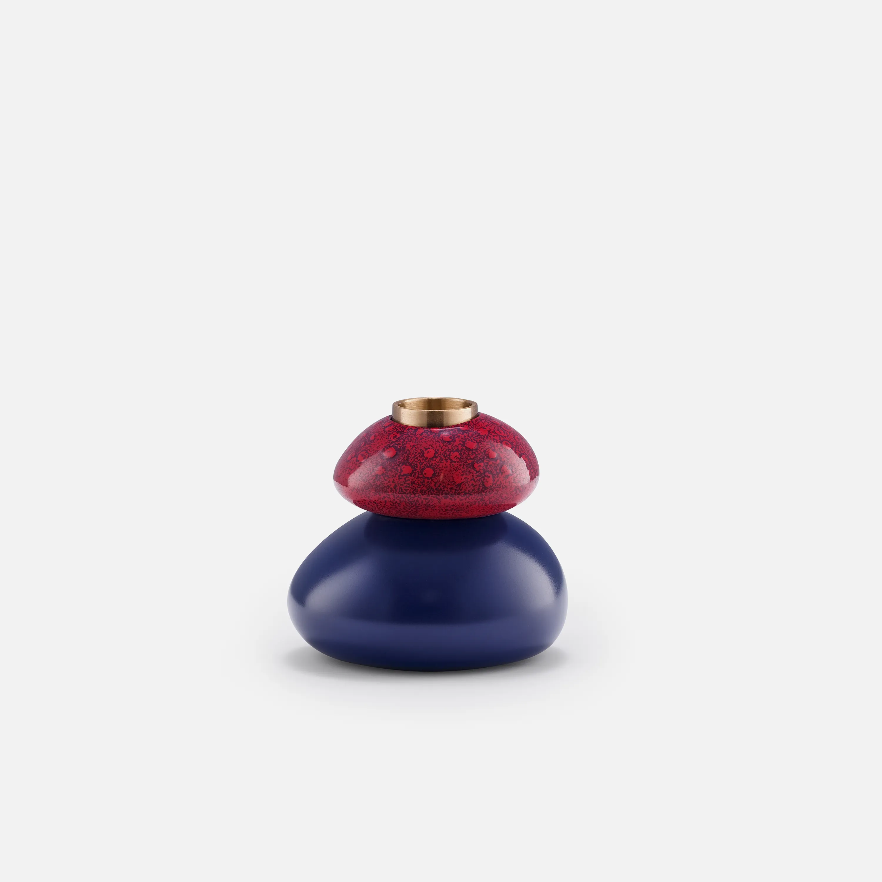 The candle holder takes on a unique shape, inspired by stacked pebbles forming a solid structure. Each detail applies a different lacquer technique: the navy pebble is coated for a refined glossy finish, while the red pebble is hand-treated with a dotted technique.