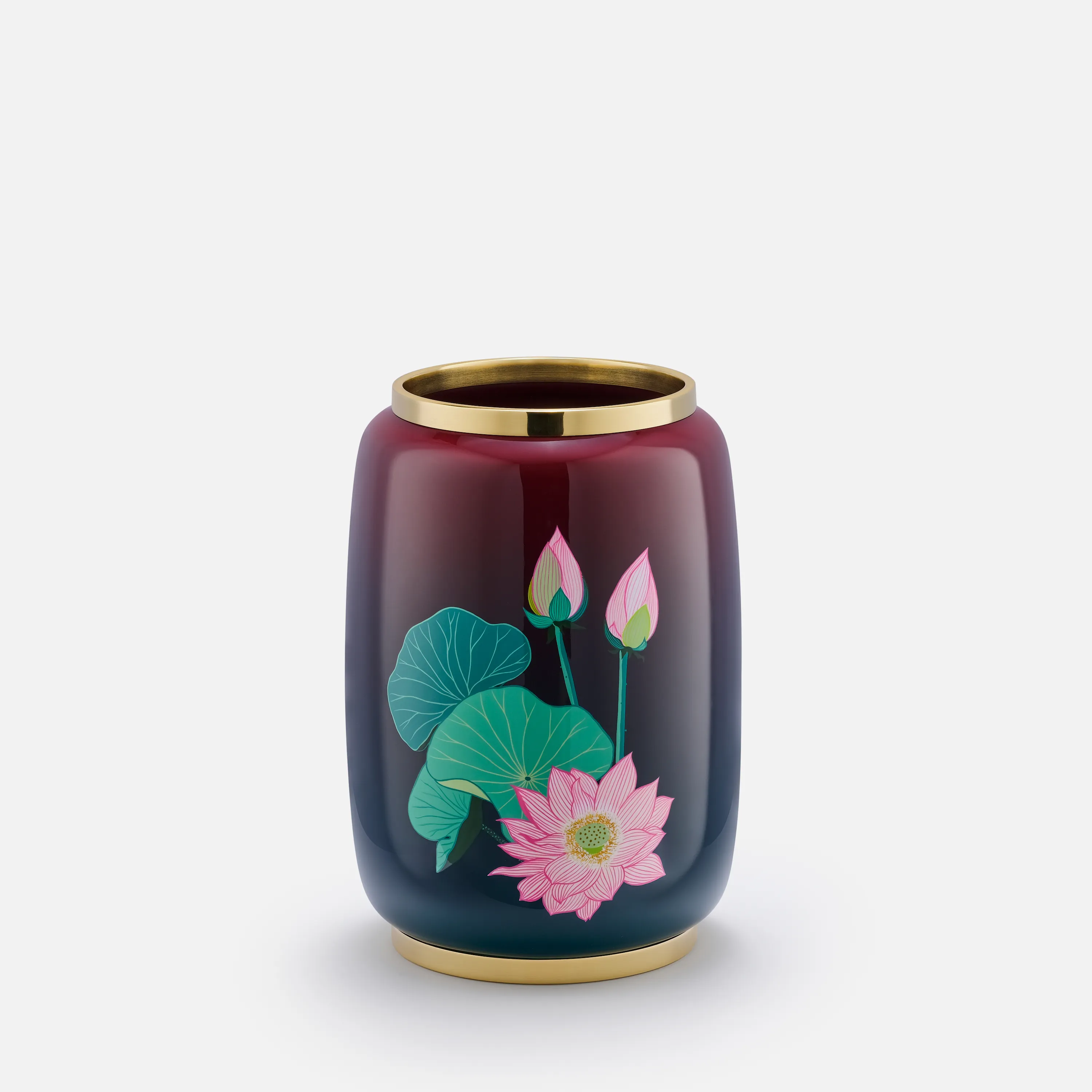 On the vase, the lotus motif is delicately depicted, with a budding flower reaching alongside a fully bloomed blossom. Every detail – from petals and seed pods to the fine leaf veins – is meticulously hand-painted, infusing the piece with vibrant vitality.