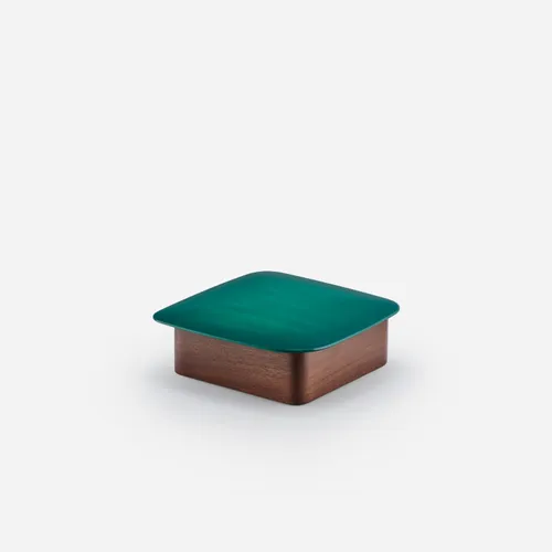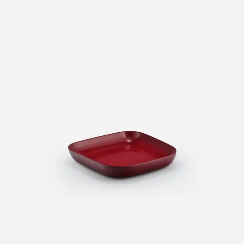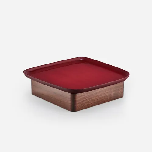 The square yellow lacquer tray features a sanded effect on the product's surface. The tray base is crafted with walnut wood with natural wood grain.