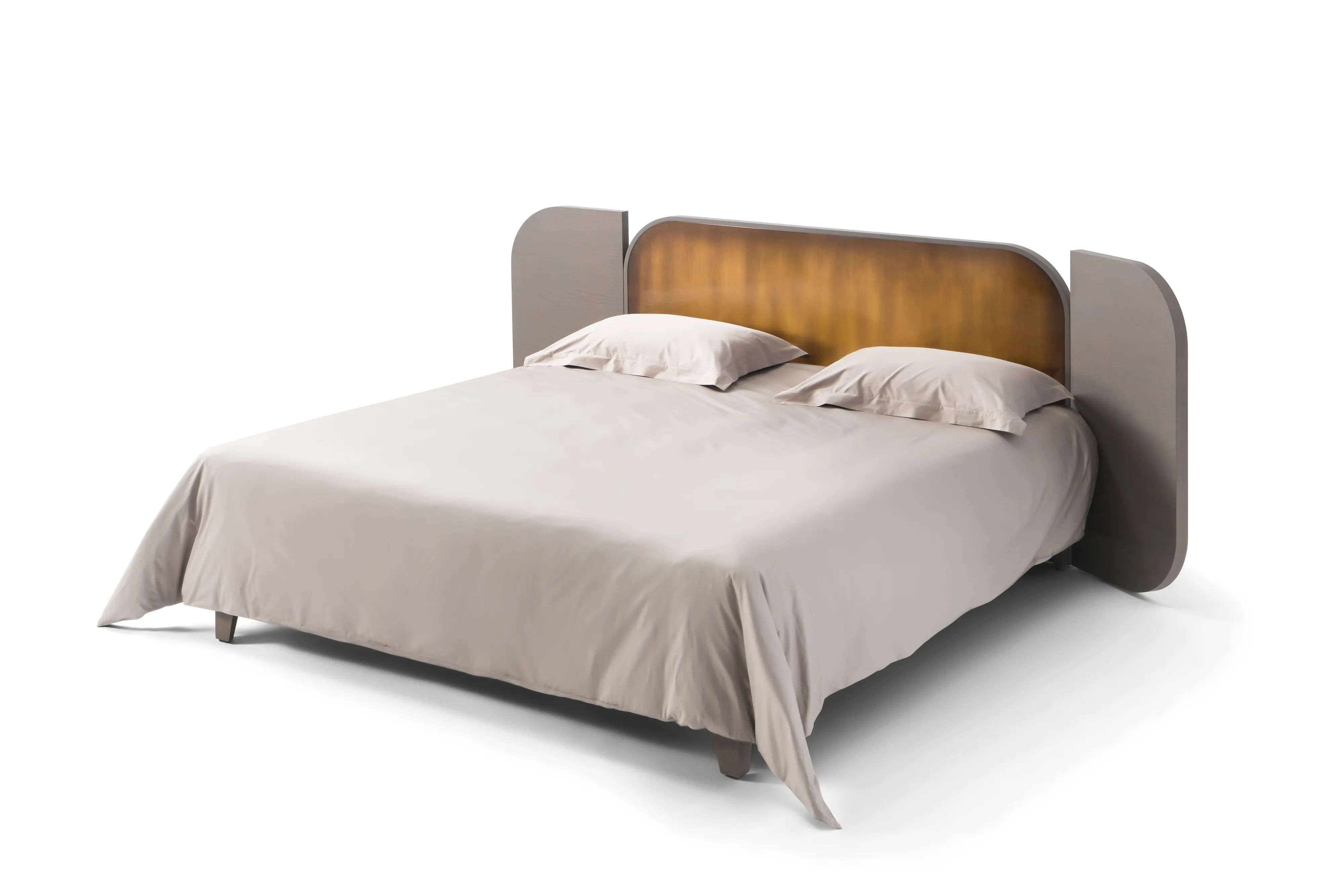 The harmonious combination between tradition and modernity was highlighted in the headboard design with two wings that can be opened and closed, bringing a freshness to the Velvety. The shiny finish of the middle-lacquered piece contrasts with the matte finish of the painted pieces on both sides, adding a special touch to the bed. The headboard is made of lacquered wood with a unique sanded colour texture. The frame is made of painted wood with matte finishing or lacquered wood. This product is available in four colour options: gray, red, brown, and yellow.