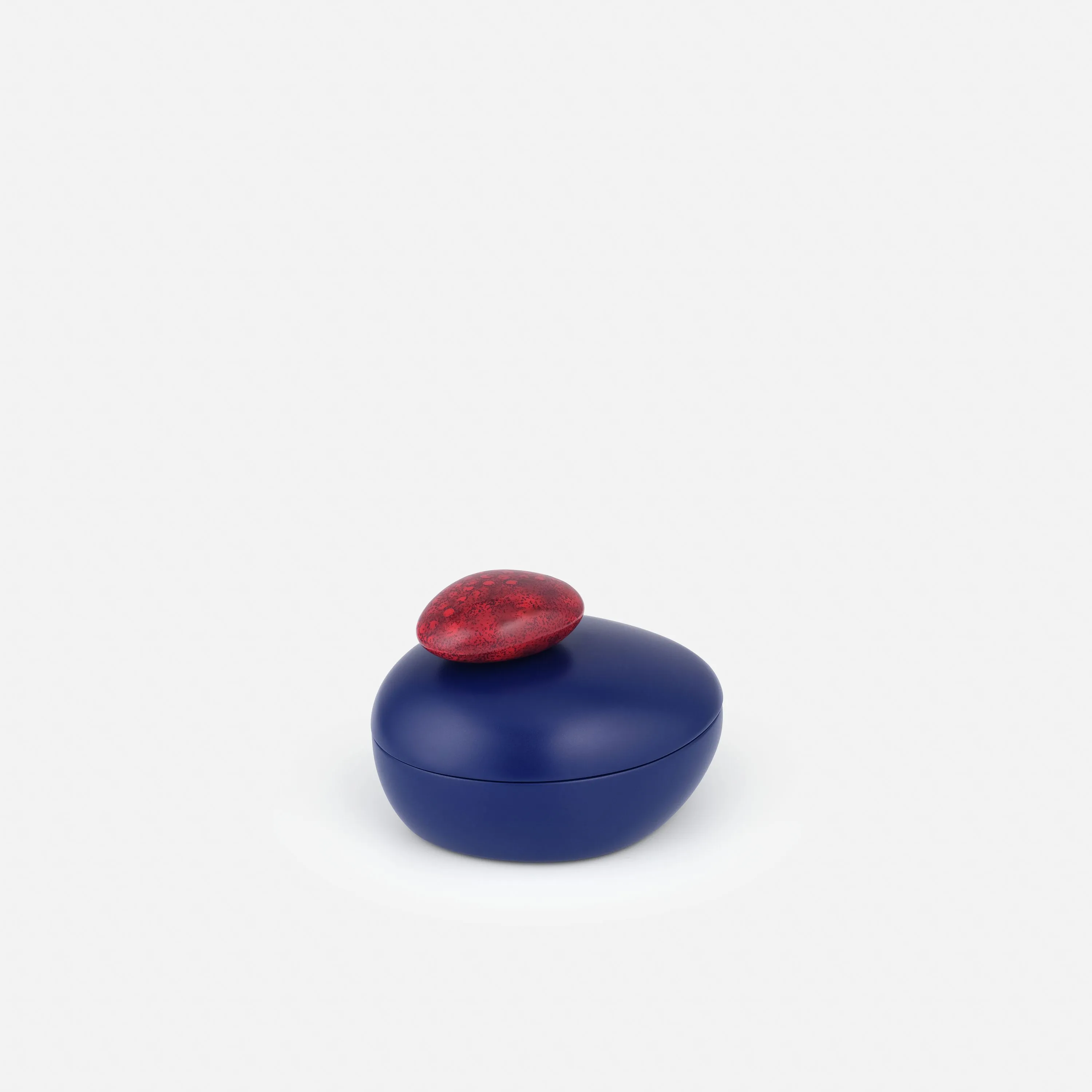 Chiếc hộp sơn mài oval sử dụng hiệu ứng sơn mài độc đáo với tông màu xanh dương sang trọng. Nắp hộp gắn viên đá cuội được tạo tác bằng kỹ thuật mài kết hợp chấm màu bằng tay để tạo điểm nhấn nổi bật cho sản phẩm.