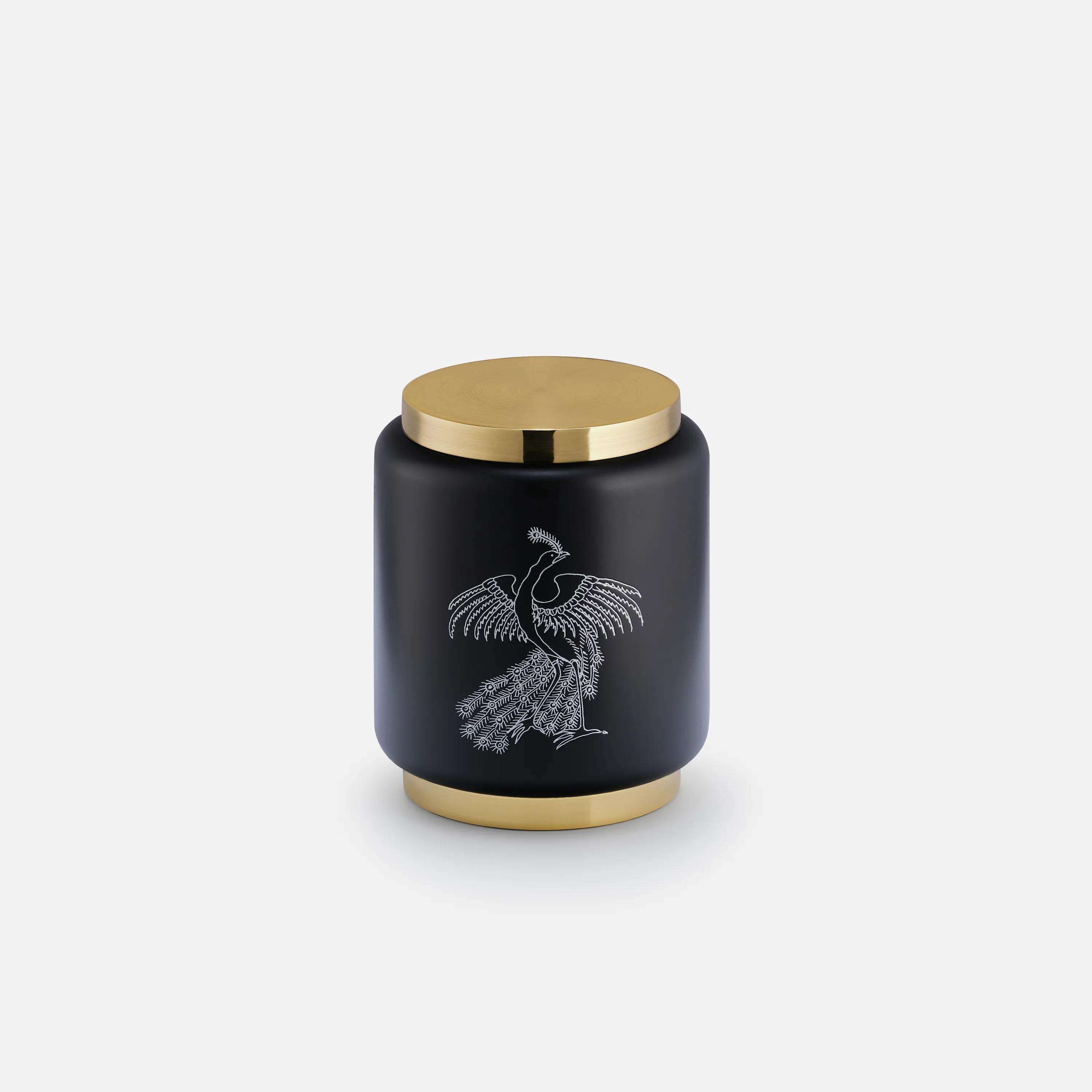 Trên nền sơn mài đen tuyền, họa tiết chim công hiện lên duyên dáng nhờ kỹ thuật vẽ tay đắp nổi, ánh lên vẻ lấp lánh đầy cuốn hút dưới ánh sáng. Sản phẩm được chế tác với hai phiên bản: khắc vào màu nhũ vàng và nhũ bạc, đem lại những trải nghiệm thị giác khác biệt.