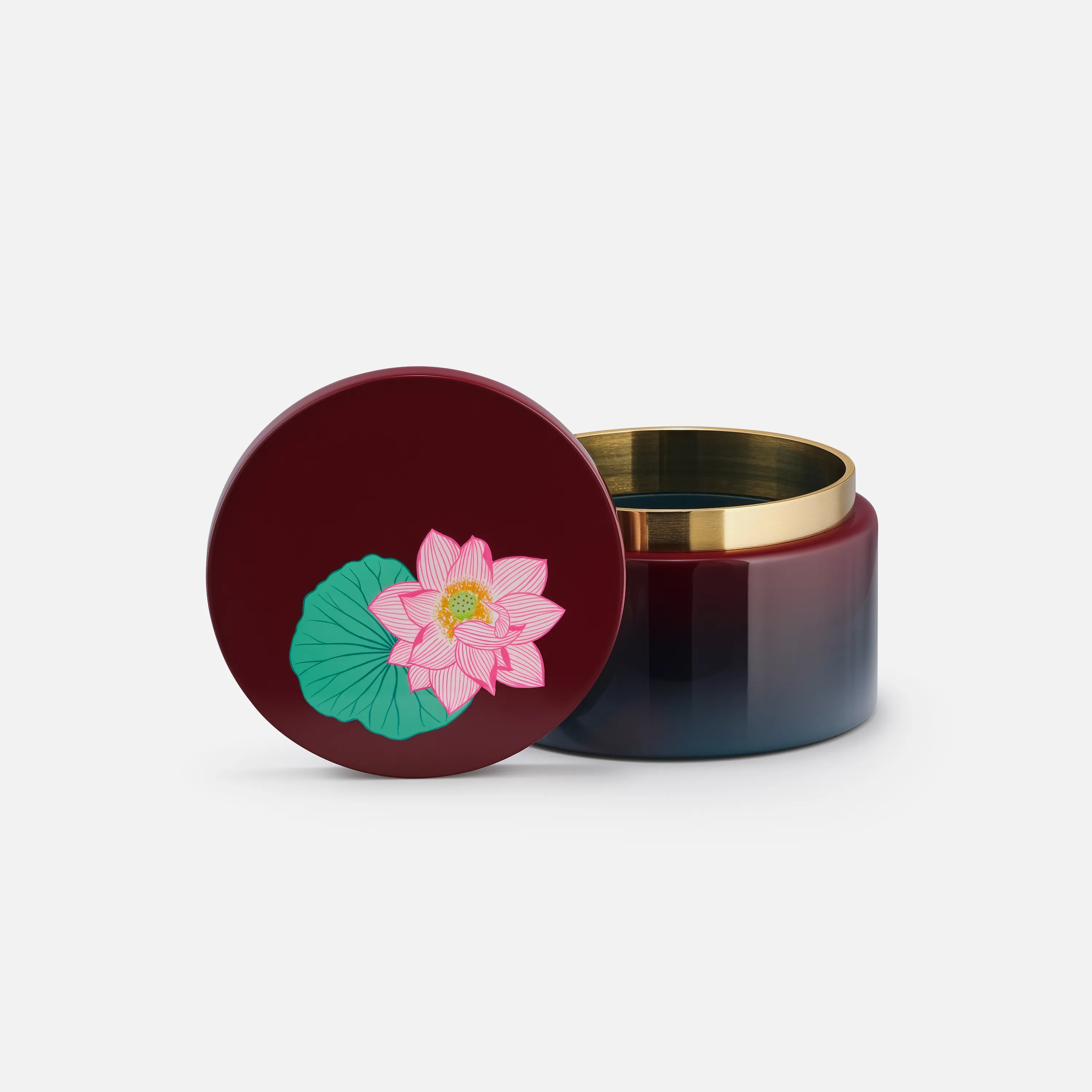 Hộp tròn được tô điểm bằng hình ảnh đóa sen trong thời kỳ rực rỡ nhất. Từng chi tiết – từ cánh hoa, đài sen cho đến những đường gân mảnh trên lá – đều được vẽ tay tỉ mỉ, như thổi vào sản phẩm một luồng sinh khí căng tràn.