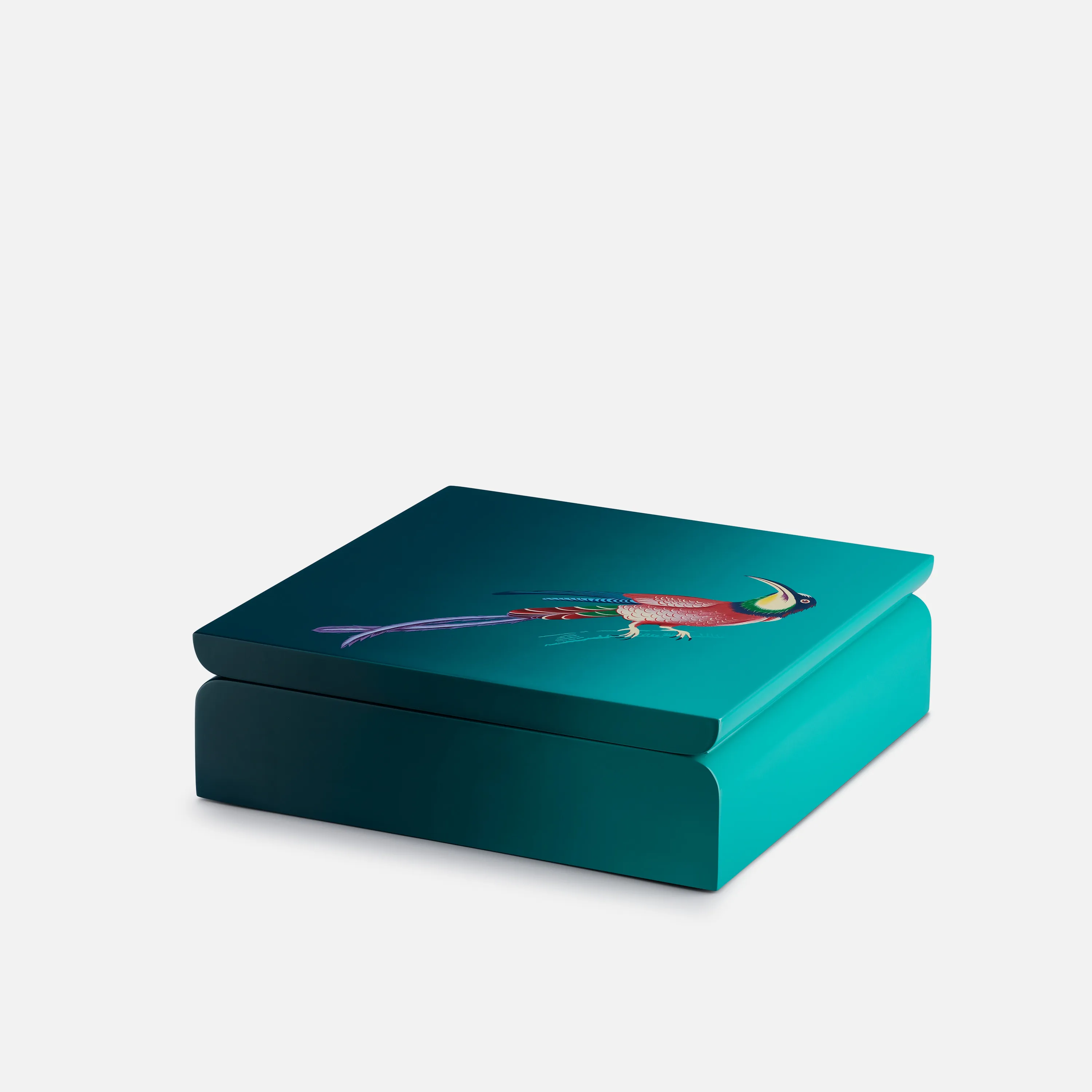 Hộp vuông với hình ảnh chim ruồi vẽ tay trên nền màu xanh lan màu. Họa tiết gây ấn tượng với bộ lông đa sắc được khắc họa tinh xảo. Các mảng màu được xử lý tách biệt theo từng vùng hình thể, đảm bảo độ chuẩn xác và sự cộng hưởng hài hòa về sắc độ. Nét vẽ thủ công đồng thời làm nổi bật dáng vẻ linh động của con vật trên nền sơn mài.