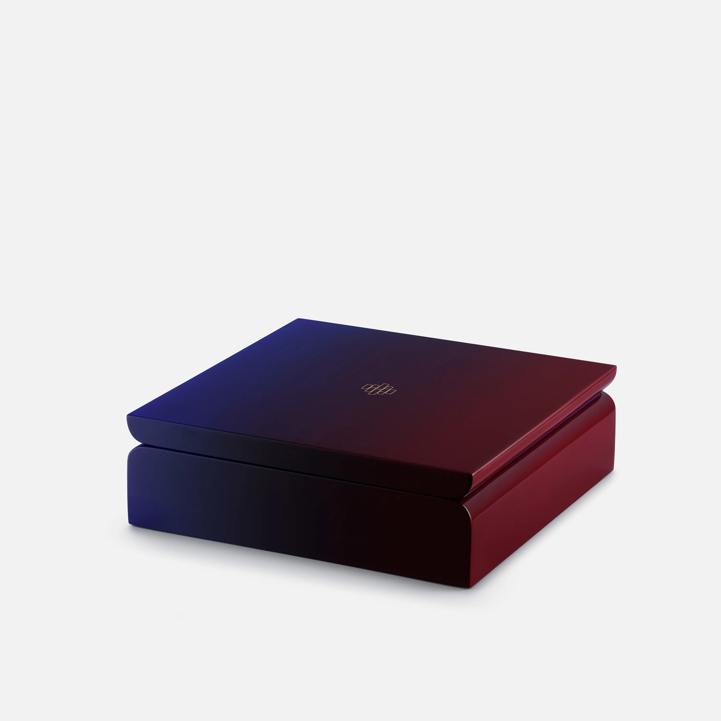 Hộp vuông Moonbow ứng dụng kỹ thuật lan màu với hai tông xanh dương và tím để tạo hiệu ứng chuyển sắc. Nắp hộp được hoàn thiện bằng chi tiết khắc vào màu nhũ vàng để tạo điểm nhấn.