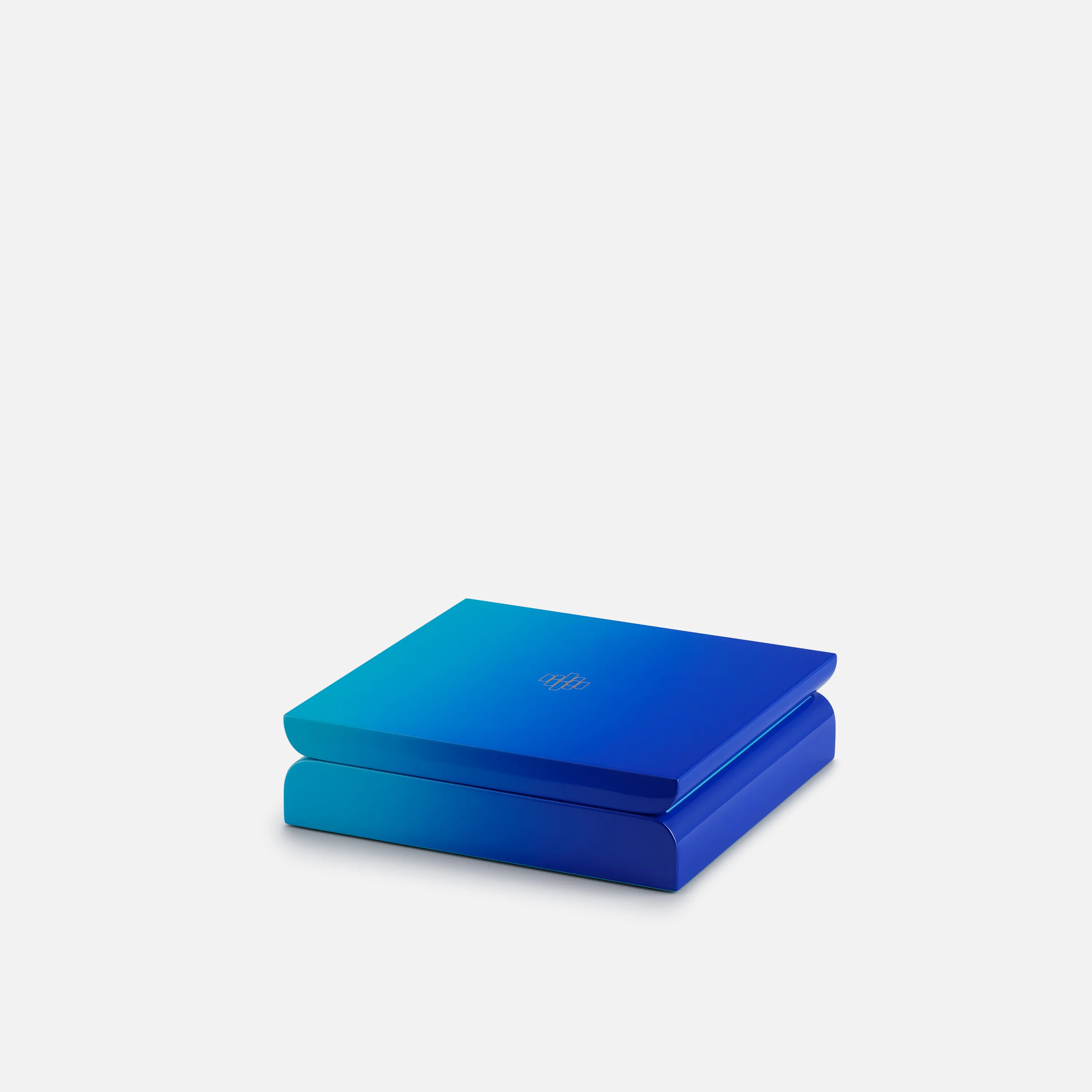 Hộp vuông Moonbow lấy màu xanh dương đậm làm chủ đạo kết hợp kỹ thuật lan màu, tạo hiệu ứng chuyển sắc mềm mại. Nắp hộp được hoàn thiện bằng chi tiết khắc vào màu nhũ vàng để tạo điểm nhấn.