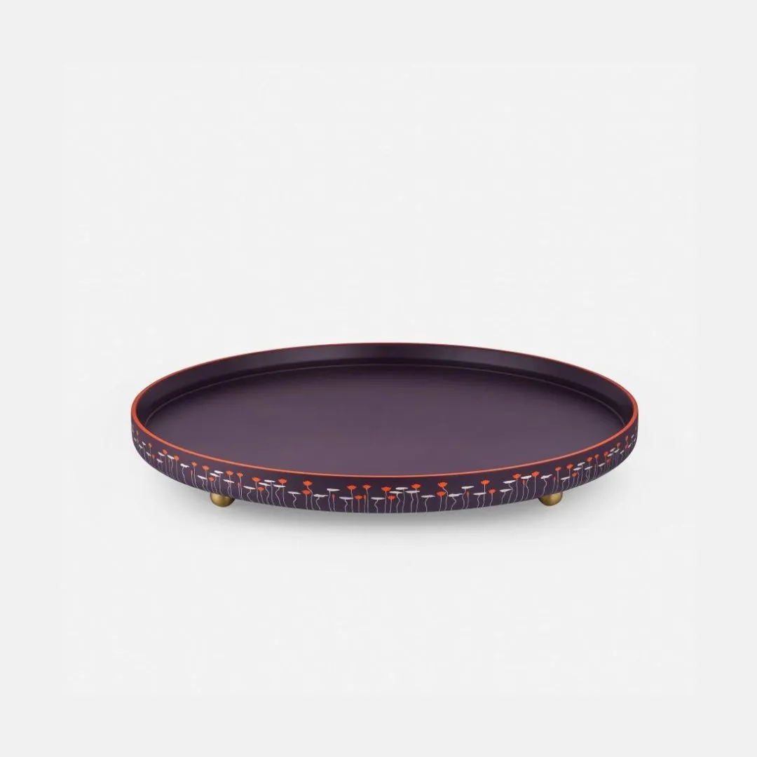 Viền khay tròn ứng dụng dụng kỹ thuật vẽ tay khéo léo tạo nên một vườn sen với những đóa hoa thanh nhã khoe sắc. Sản phẩm có hai phiên bản: màu tím và màu xanh cổ vịt.