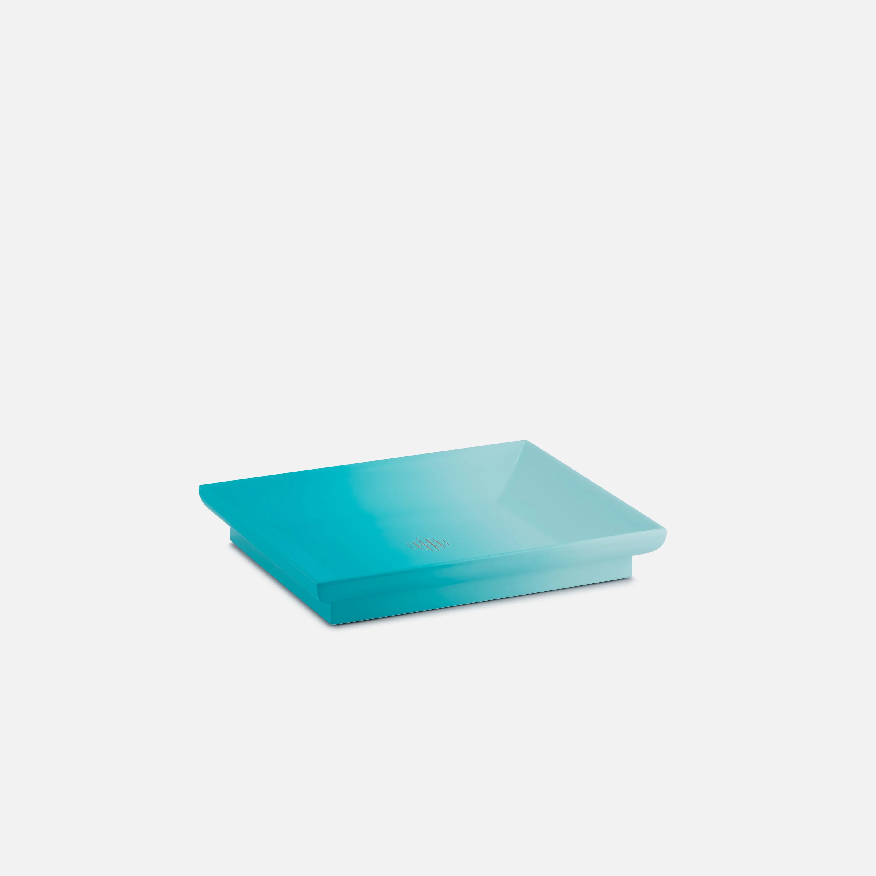 Khay vuông Moonbow lấy màu xanh dương nhạt làm chủ đạo kết hợp kỹ thuật lan màu, tạo hiệu ứng chuyển sắc mềm mại. Lòng khay được hoàn thiện bằng chi tiết khắc vào màu nhũ vàng để tạo điểm nhấn.