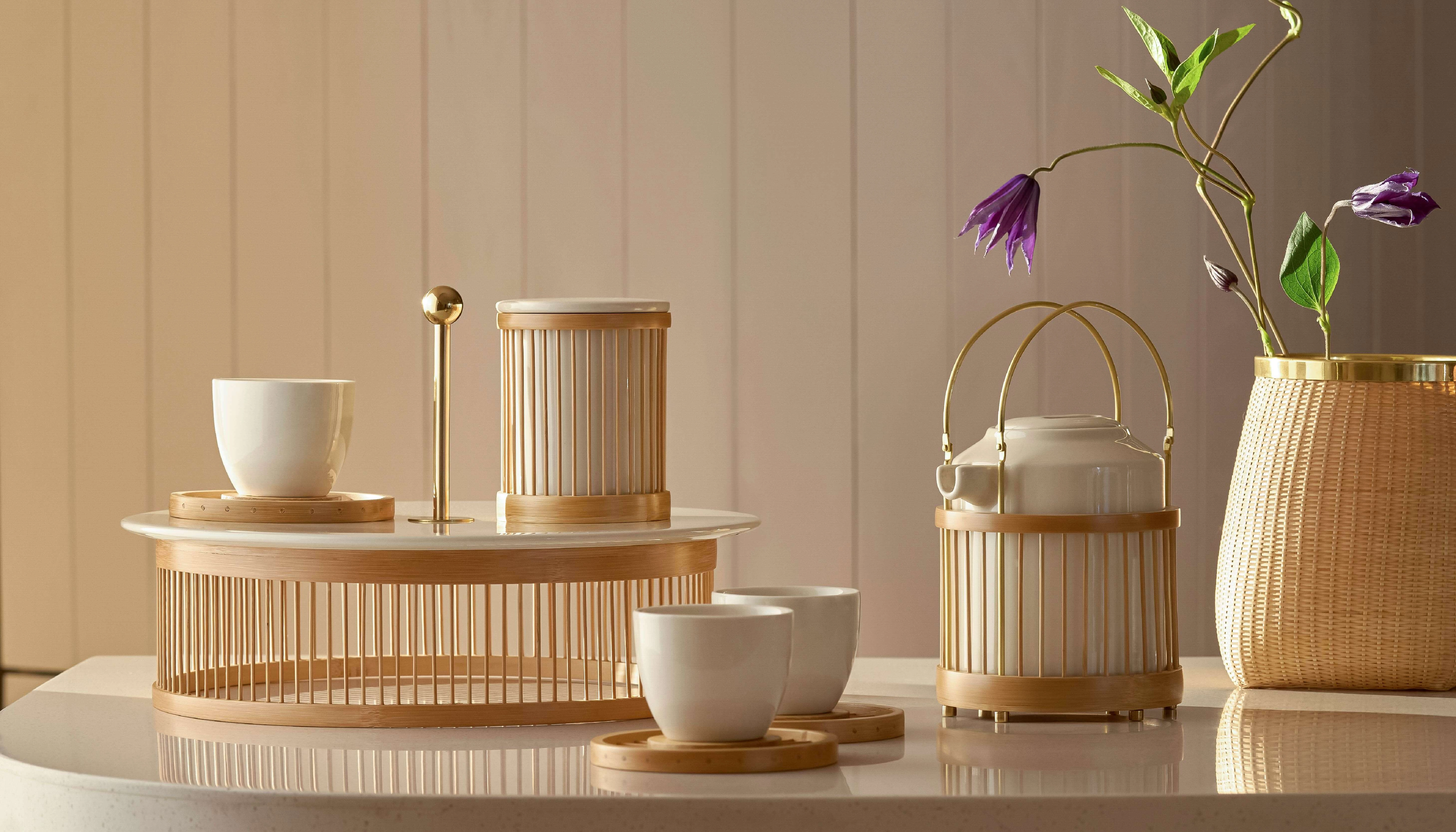 Bộ thưởng trà Serene là sự kết hợp giữa kỹ thuật làm gốm tinh xảo và nghệ thuật chế tác lồng chim.