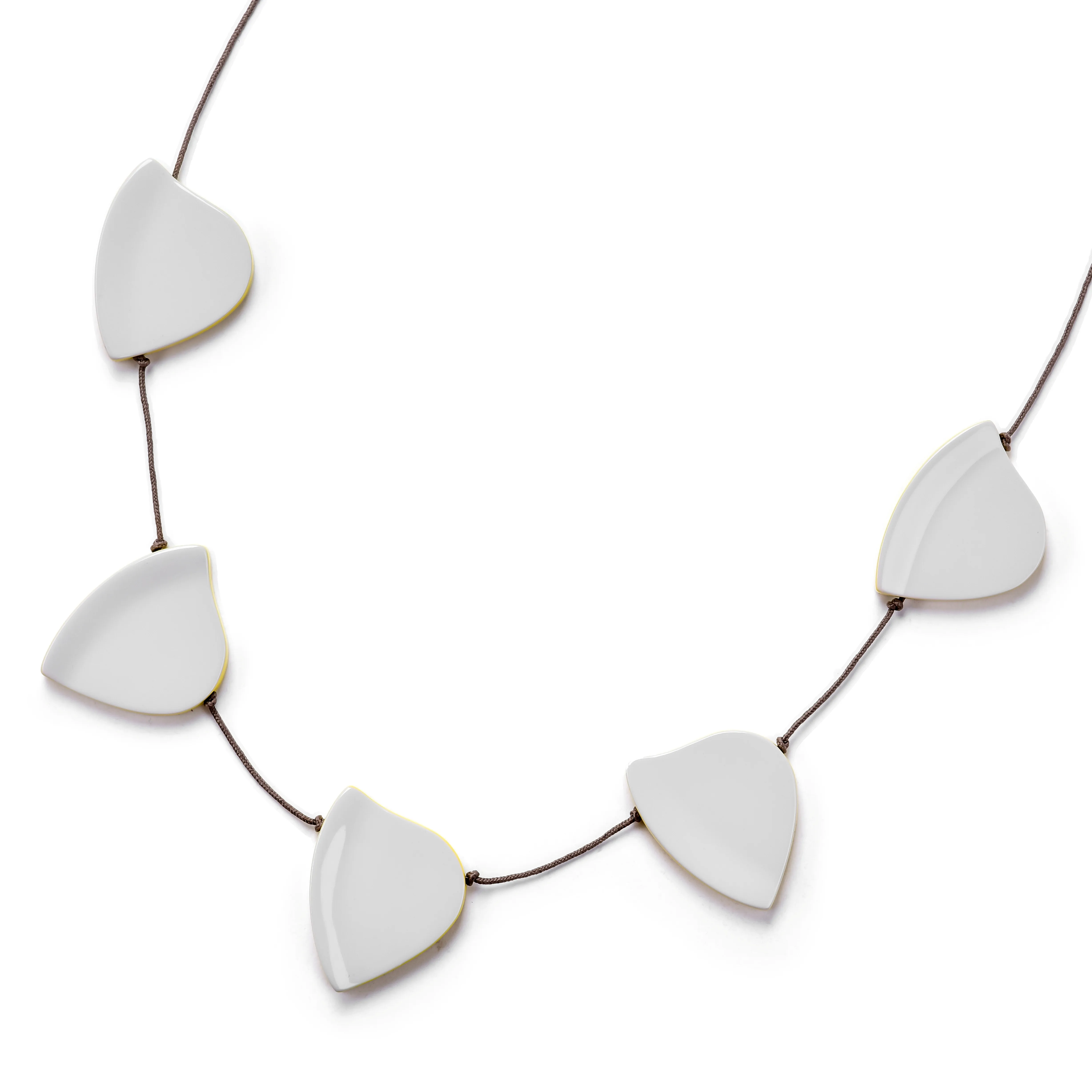 Lấy cảm hứng từ thực vật, Hoa là bộ sưu tập vui vẻ, thể hiện tính năng động qua màu sắc của sơn mài. Mẫu vòng đeo cổ dài sử dụng hai màu vàng nụ tươi đối lập với ghi để tạo điểm nhấn.