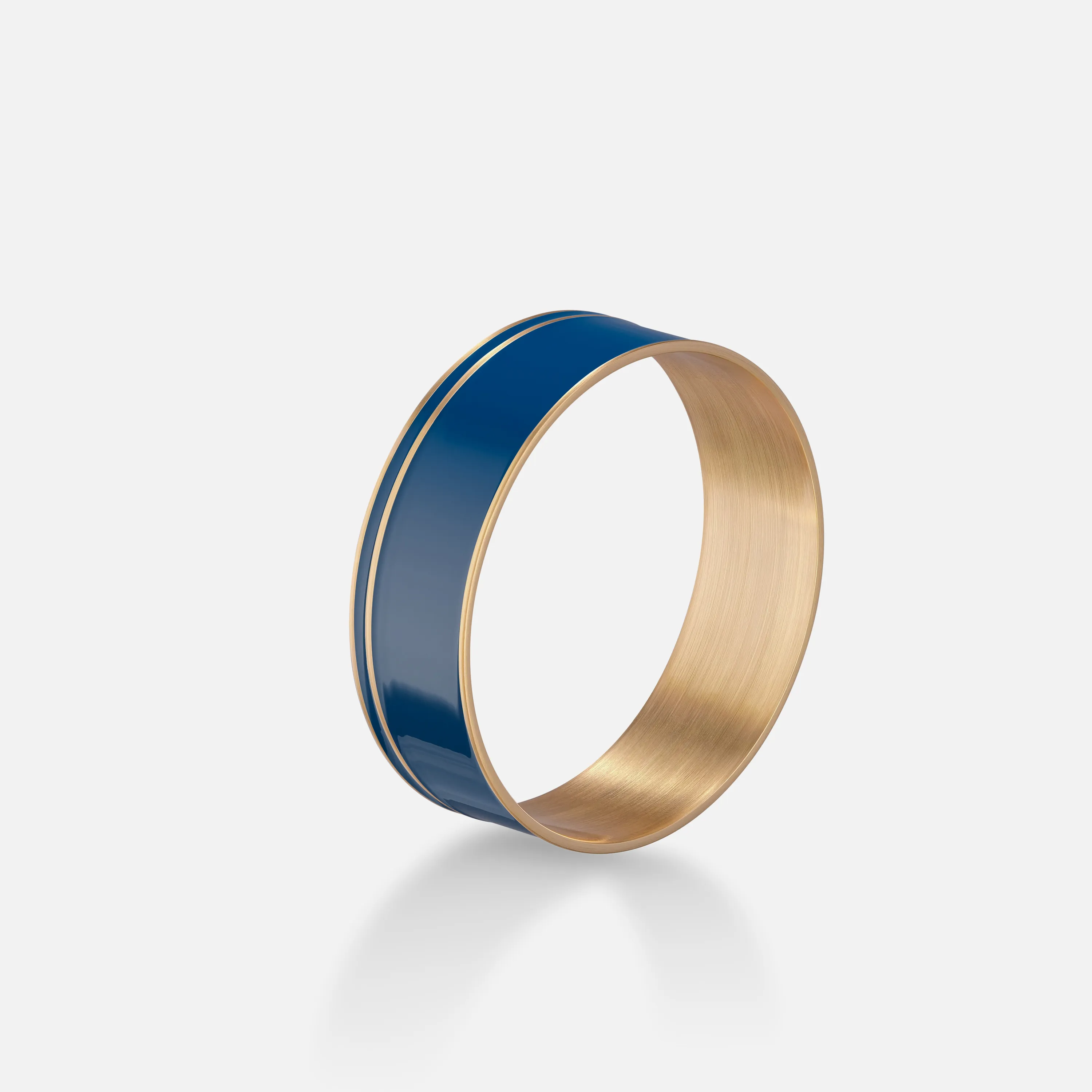 Chiếc vòng tay sở hữu thiết kế tối giản, mặt ngoài phủ sơn mài, mặt trong là màu đồng ánh kim, tạo nên sự đối lập màu sắc cuốn hút. Sản phẩm có bảng màu đa dạng, trải dài từ tông nhạt đến đậm: trắng, hồng, xanh ngọc, nâu, đỏ đậm, xanh lam đậm và đen.