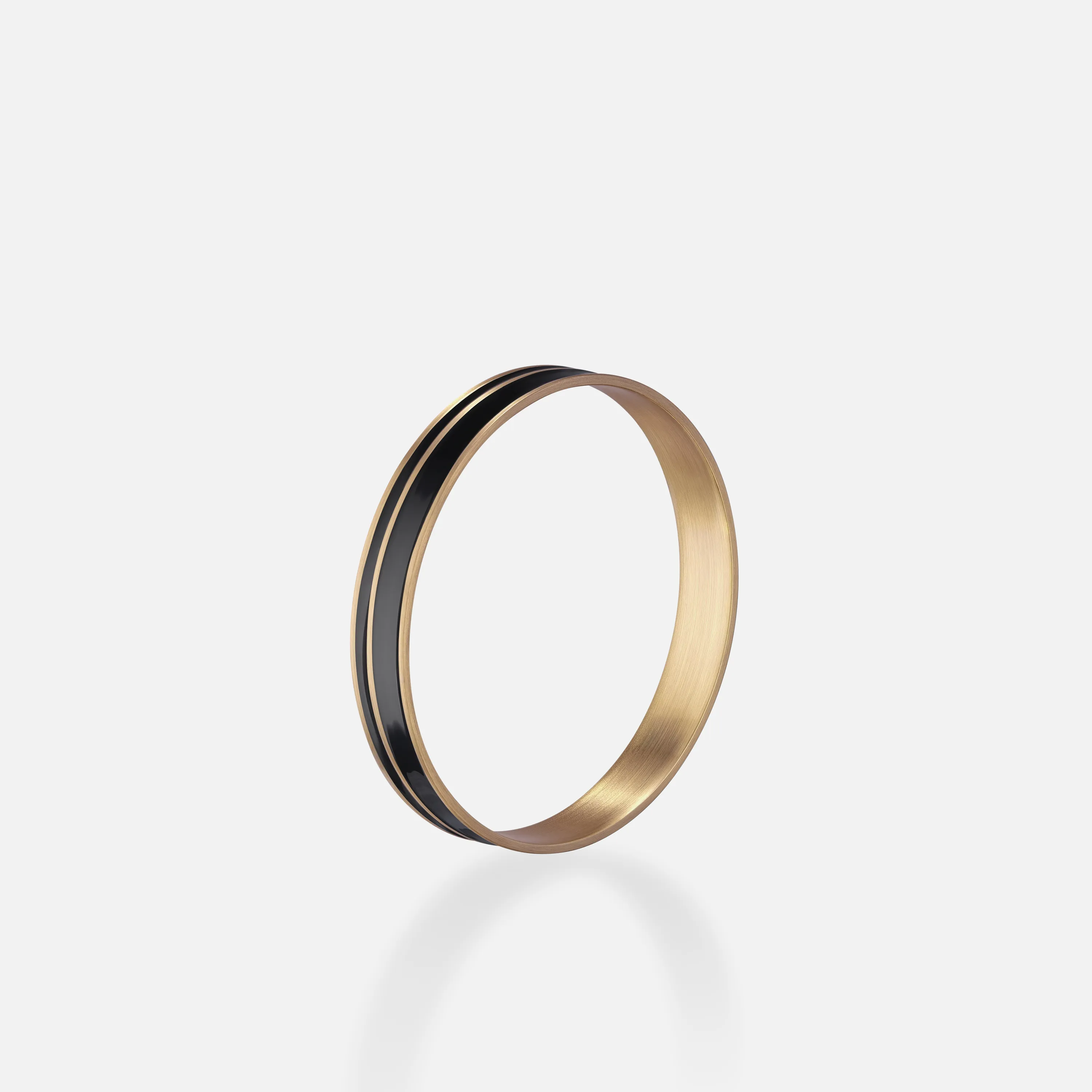 Chiếc vòng tay sở hữu thiết kế tối giản, mặt ngoài phủ sơn mài, mặt trong là màu đồng ánh kim, tạo nên sự đối lập màu sắc cuốn hút. Sản phẩm có bảng màu đa dạng, trải dài từ tông nhạt đến đậm: trắng, hồng, xanh ngọc, nâu, đỏ đậm, xanh lam đậm và đen.